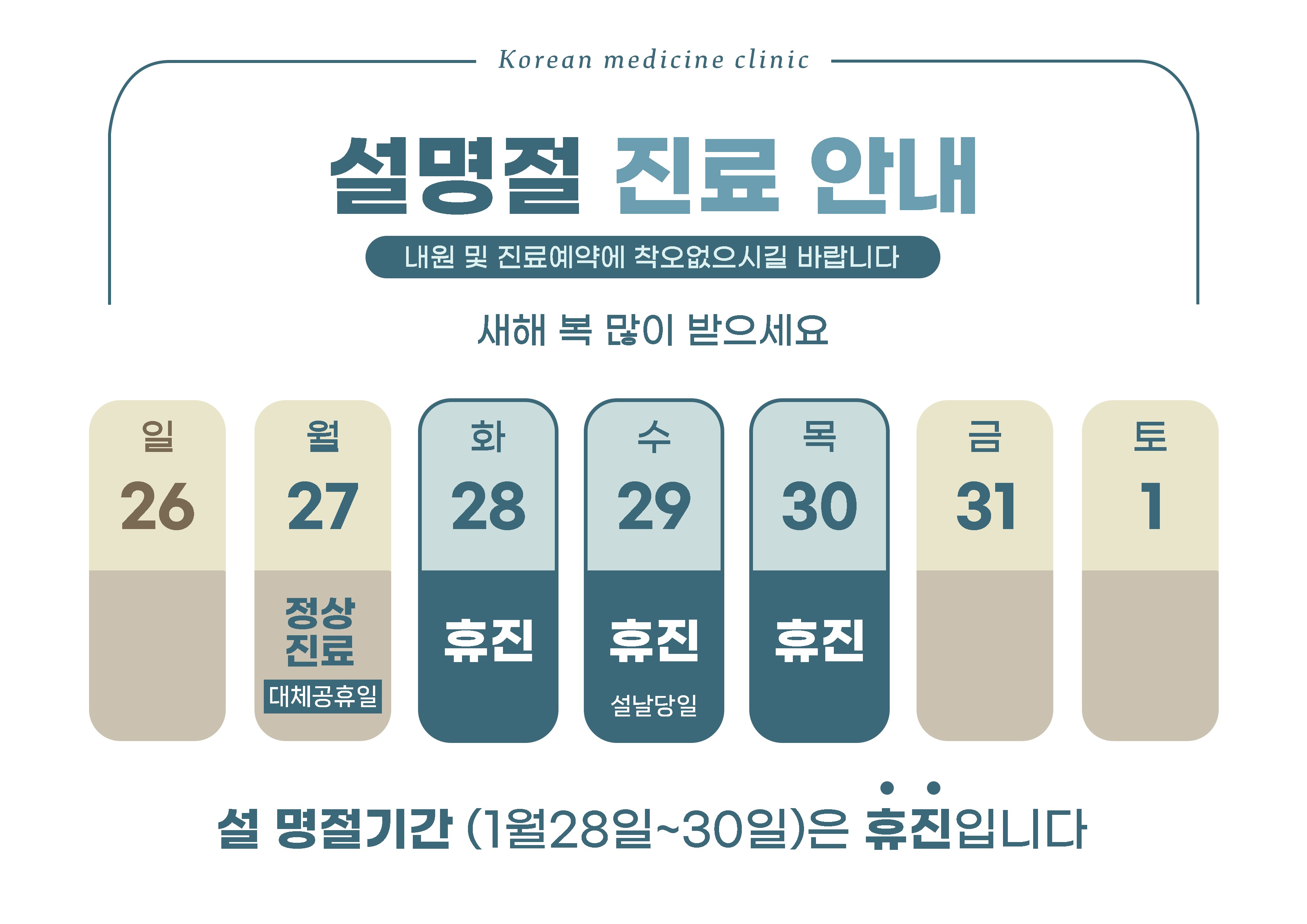 인쇄 스크랩 목록 2025년 설(구정) 연휴 근무시간 안내 페이지 정보 강변향기나무한의원 818 0 2025-01-11 16:32:24 관련링크 http://www.rivertree-clinic.com/data/editor/2501/26e0941e81fc2887fc372e2d12b864ff_1736580706_5434.jpg 456회 연결 본문 2025년 1월 구정(공휴일) 연휴동안1월 28일, 29일, 30일(3일간) 휴진하며1월 27일(월) 대체공휴일에는 공휴일 근무시간제로 운영되어오전 10시 ~ 오후 4시로 점심시간 없이 진료합니다.접수 마감은 오후 3시입니다.진료시간을 참조하시어 방문에 차질이 없으시길 바랍니다. 감사합니다. 인쇄 스크랩 목록 이전글 ▲2025년 3월 3일 삼일절 대체공휴일 근무시간 안내 다음글 ▼2024년 10월 9일 수요일 한글날(공휴일) 근무시간 안내 댓글목록 등록된 댓글이 없습니다. 이전글 다음글 목록